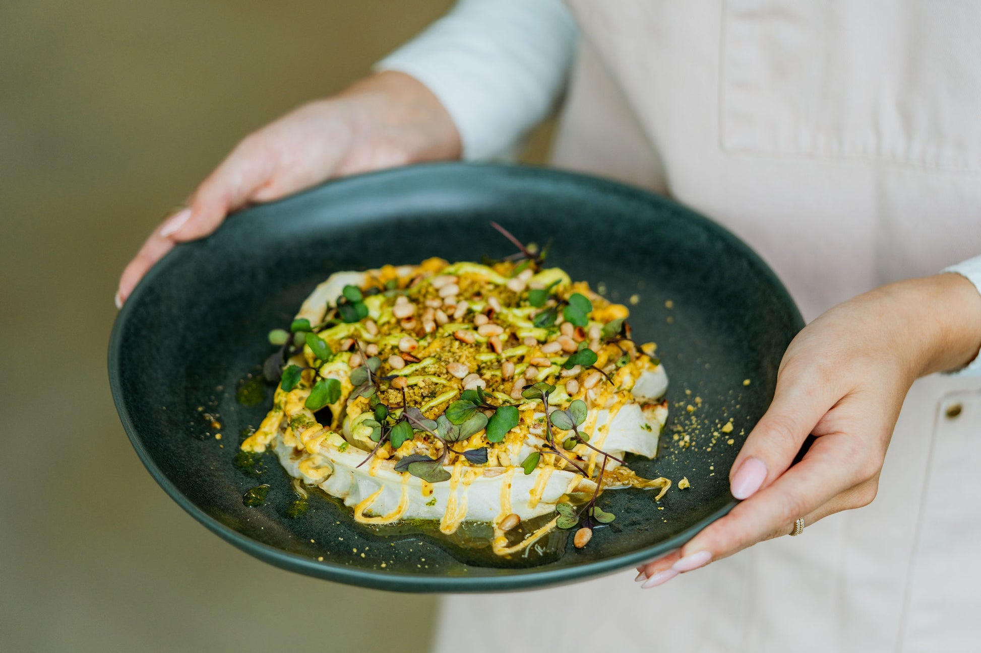 Koostis: peakapsas, õli, või (värske piim, rõõsk koor), sool, pipar, punane veiniäädikas (punane vein, antioksüdant: kaaliummetabisulfit. Sisaldab 6% looduslikke happeid), sinepimajonees (majonees (rapsiõli, vesi, suhkur, MUNAKOLLASEPULBER, sool, happesuse regulaatorid (äädikhape, sidrunhape), SINEPIPULBER, toiduvärv (beeta-karoteen). säilitusained (kaaliumsorbaat, naatriumbensoaat), stabilisaator (ksantaankummi), sinepi lõhna-ja maitseaine), sinep (joogivesi, sinepipulber, suhkur, rapsiõli, sool, happesuse regulaator (äädikhape), säilitusaine (kaaliumsorbaat)) kurkum, sool,must pipar), pestomajonees (majonees (rapsiõli, vesi, suhkur, MUNAKOLLASEPULBER, sool, happesuse regulaatorid (äädikhape, sidrunhape), SINEPIPULBER, toiduvärv (beeta-karoteen). säilitusained (kaaliumsorbaat, naatriumbensoaat), stabilisaator (ksantaankummi), sinepi lõhna-ja maitseaine), pesto (värske basiilik, värske petersell, küüslauk, sool, õli (100% rafineeritud rapsiõli, päevalilleõli), forte juust (PIIM, juuretis, tardaine kaltsiumkloriid, meresool, säilitusaine KANAMUNA LÜSOTSÜÜM. Rasva kuivaines ≥39%))), seedermänniseemned, pistaatsiapähkel