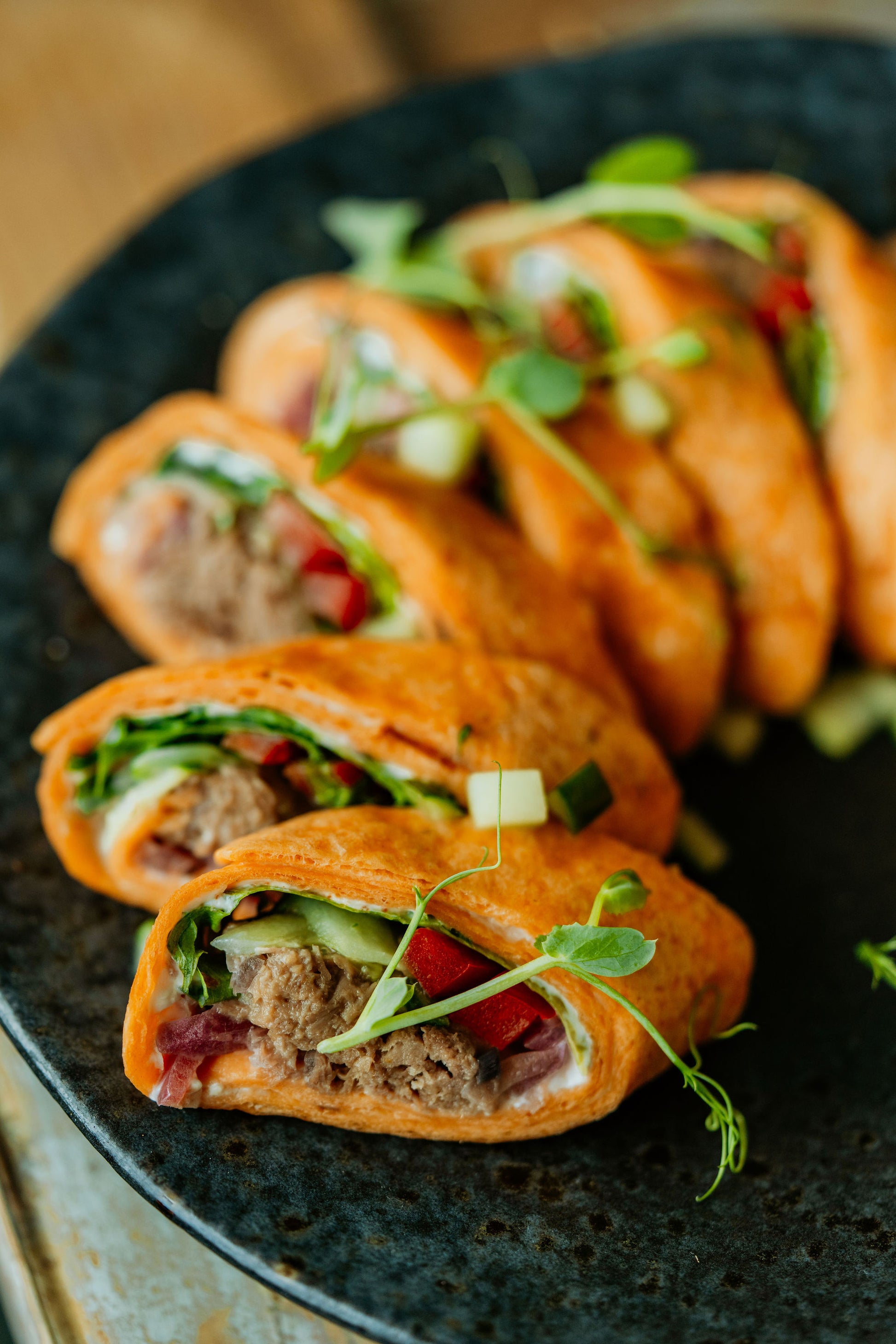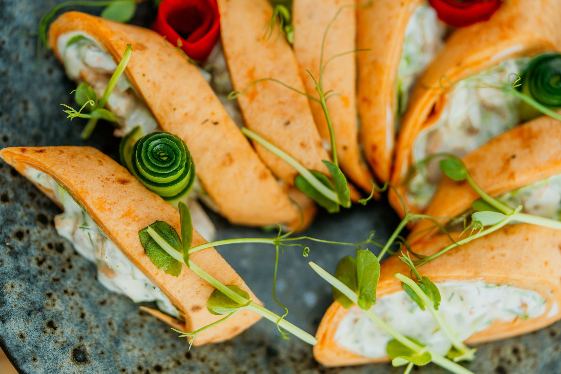 Tomatitortilla rullid erineva täidisega, 500g (20tk) Grillitud halloumi juustu / pardi confitga / grillitud krevettidega
